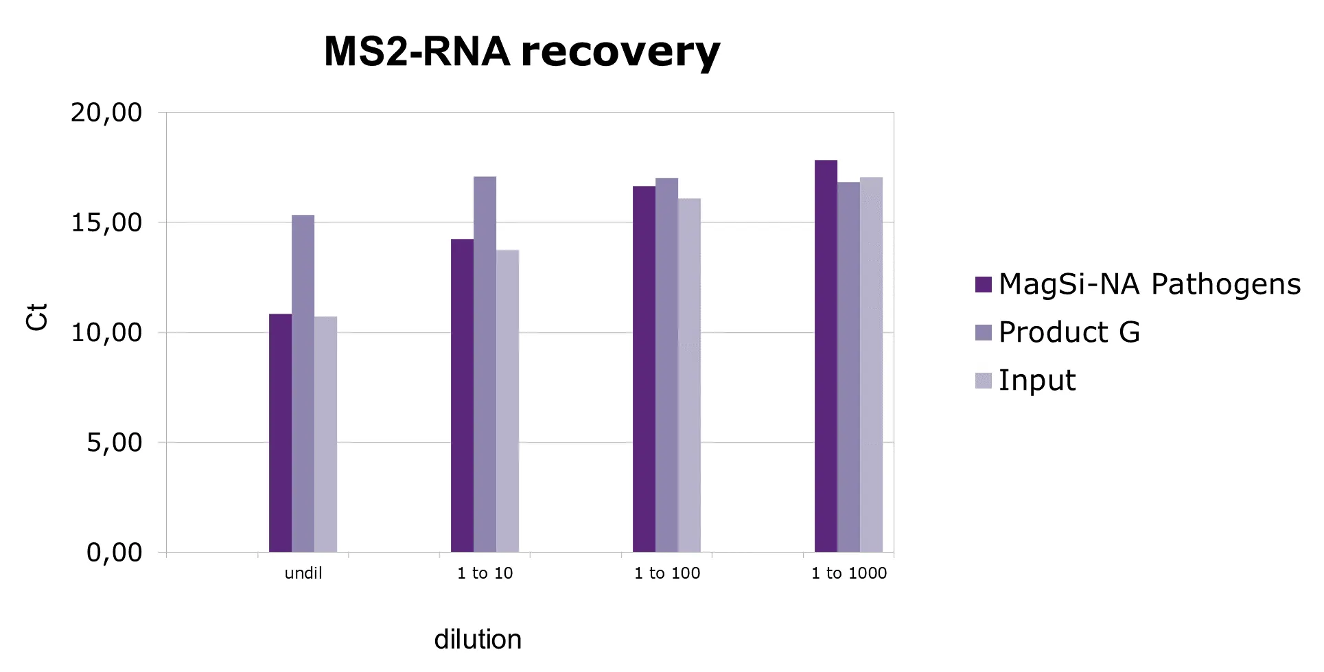 Human serum samples were spiked with varying amounts of MS phage RNA. MS2 RNA was detected by qRT-PCR assay. High recoveries were obtained with respect to the added RNA (input) and in comparison to a competitive kit (product G).