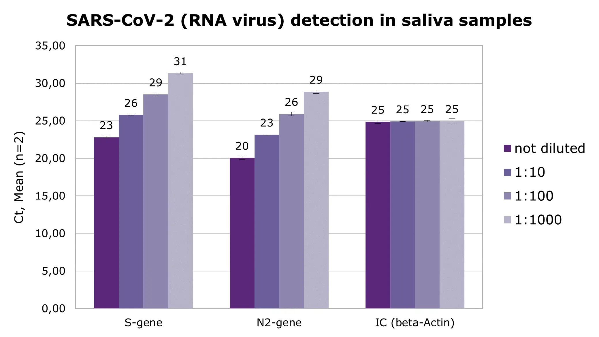 Varying amounts of SARS-CoV-2-positive saliva samples were diluted with SARS-CoV-2-negative saliva. The RNA target sequences for SARS-CoV-2 (S and N2 genes) were detected by qRT-PCR assay. All samples showed homogeneous amplification of the endogenous control gene (IC, beta-actin), ruling out PCR inhibition.