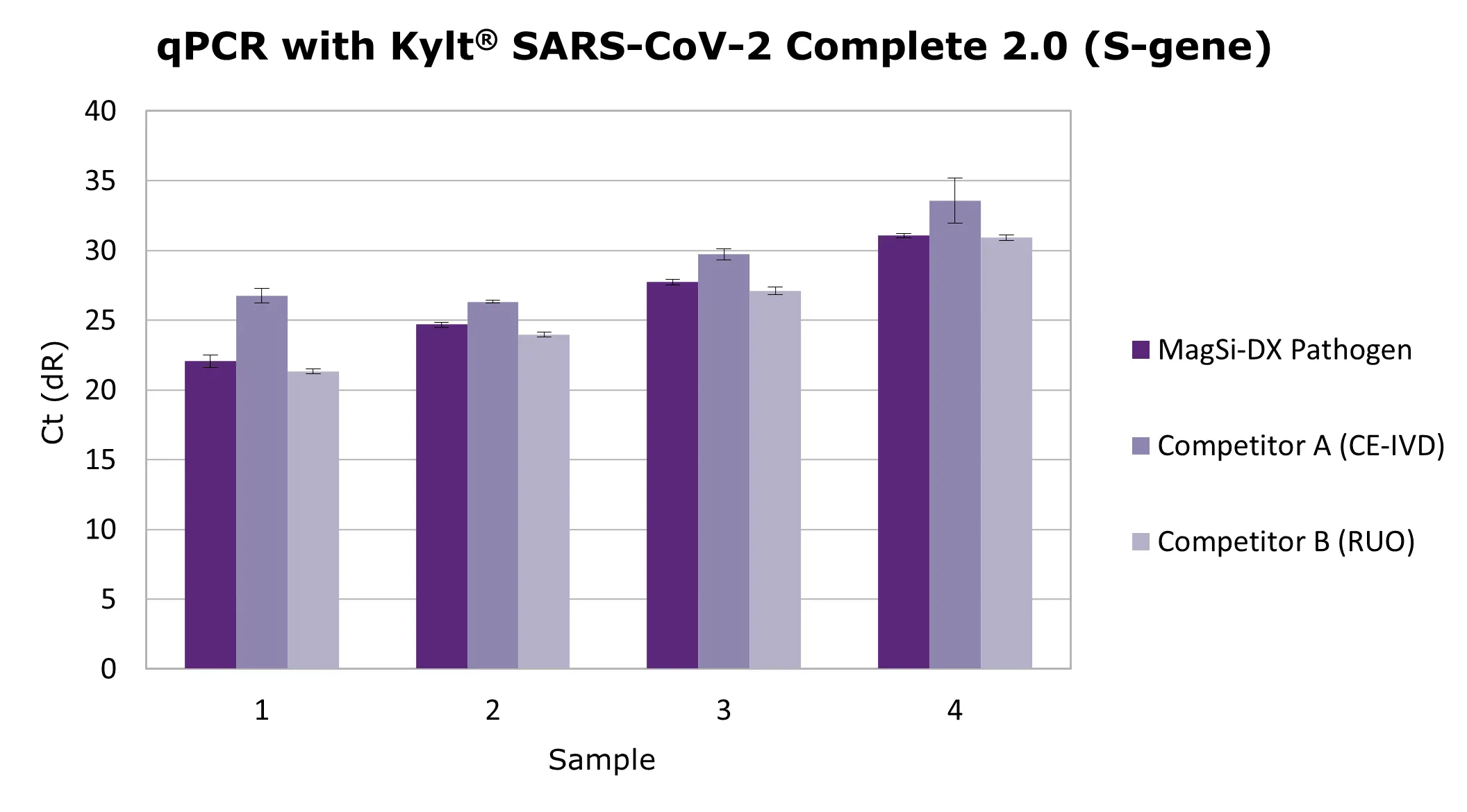 Comparison of MagSi-DX Pathogen with two competing products. Shown are the ct values from four diluted positive SARS-COV-2 samples.