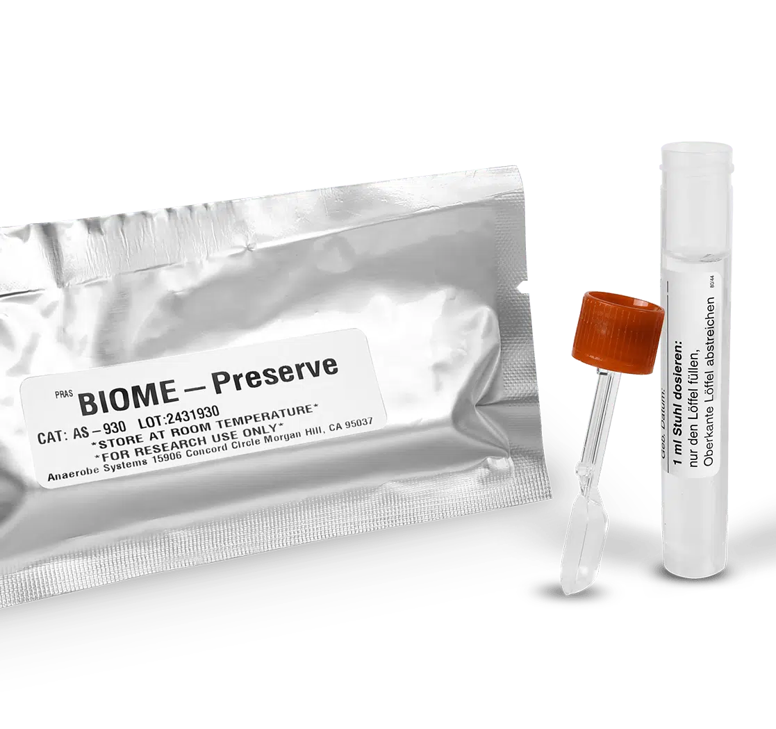 BIOME-Preserve ist ein Sammelkit, das lebende Mikrobiomproben (z. B. aus Stuhl- oder Fäkalproben) für das Wachstum und die Isolierung von anaeroben und fakultativ anaeroben Mikroorganismen konserviert.