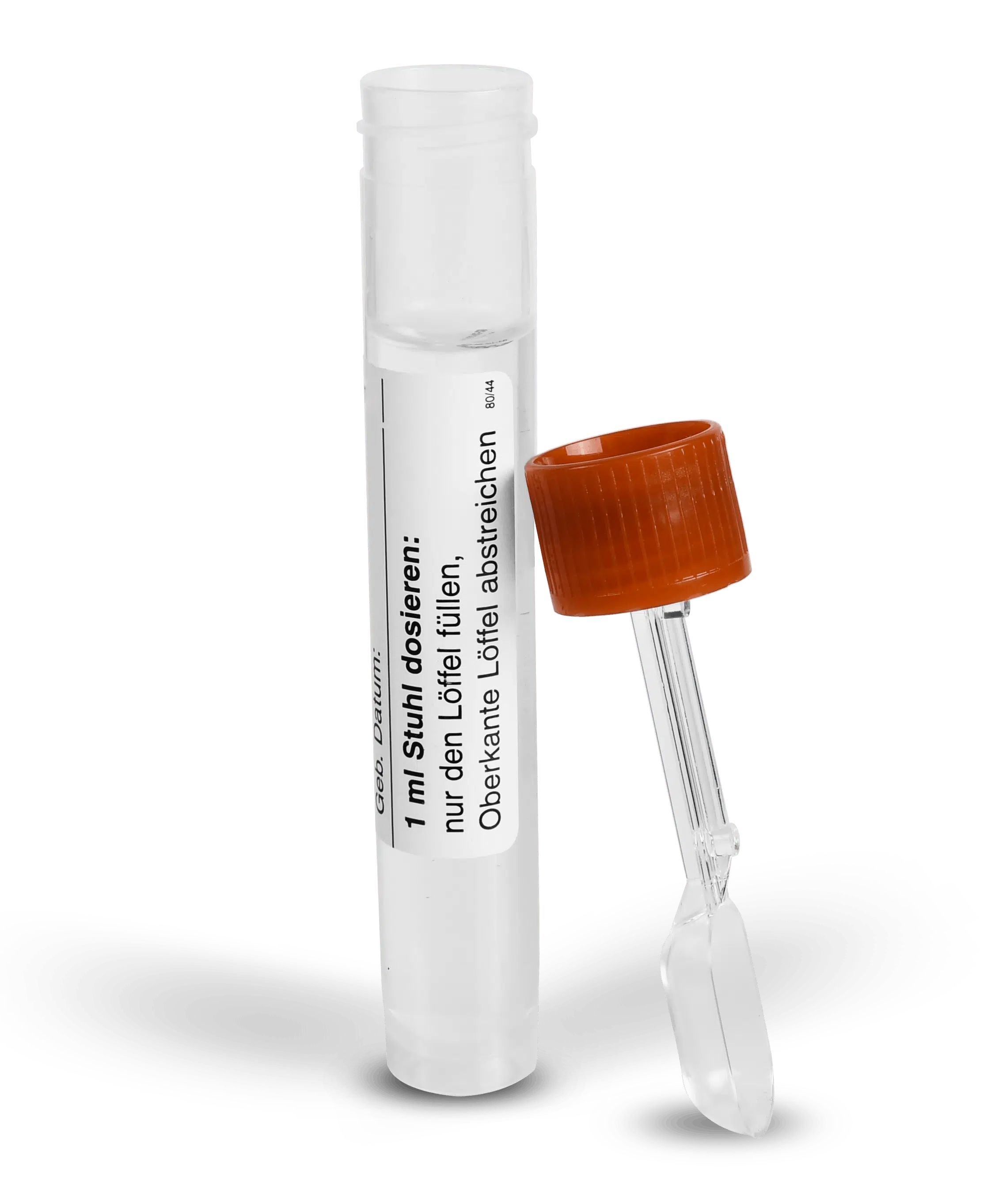 Stuhlsammelröhrchen mit integriertem 1 mL-Sammelschöpfer an der Kappe.